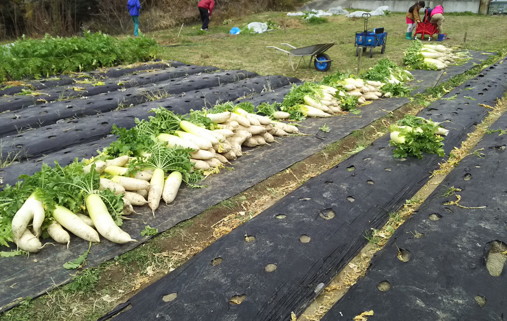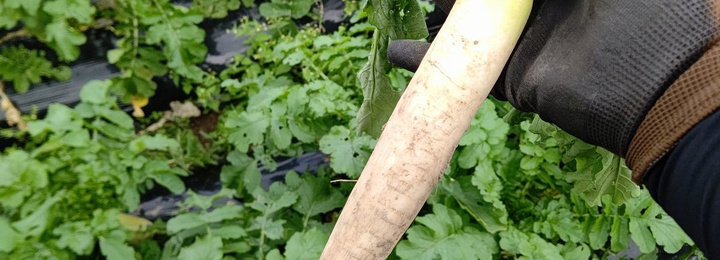 今年9月&10月に植えた青首だいこんと聖護院だいこんの収穫際となります。青首大根は総太り型で、煮炊き系以外でも生スティック野菜や擦りおろしなどに活用できる万能品種になります。聖護院大根は関西では珍しい丸型大根で、やわらかく肉質が緻密な為、煮物に向いています。スーパーなどではあまり販売されない品種なので希少です。